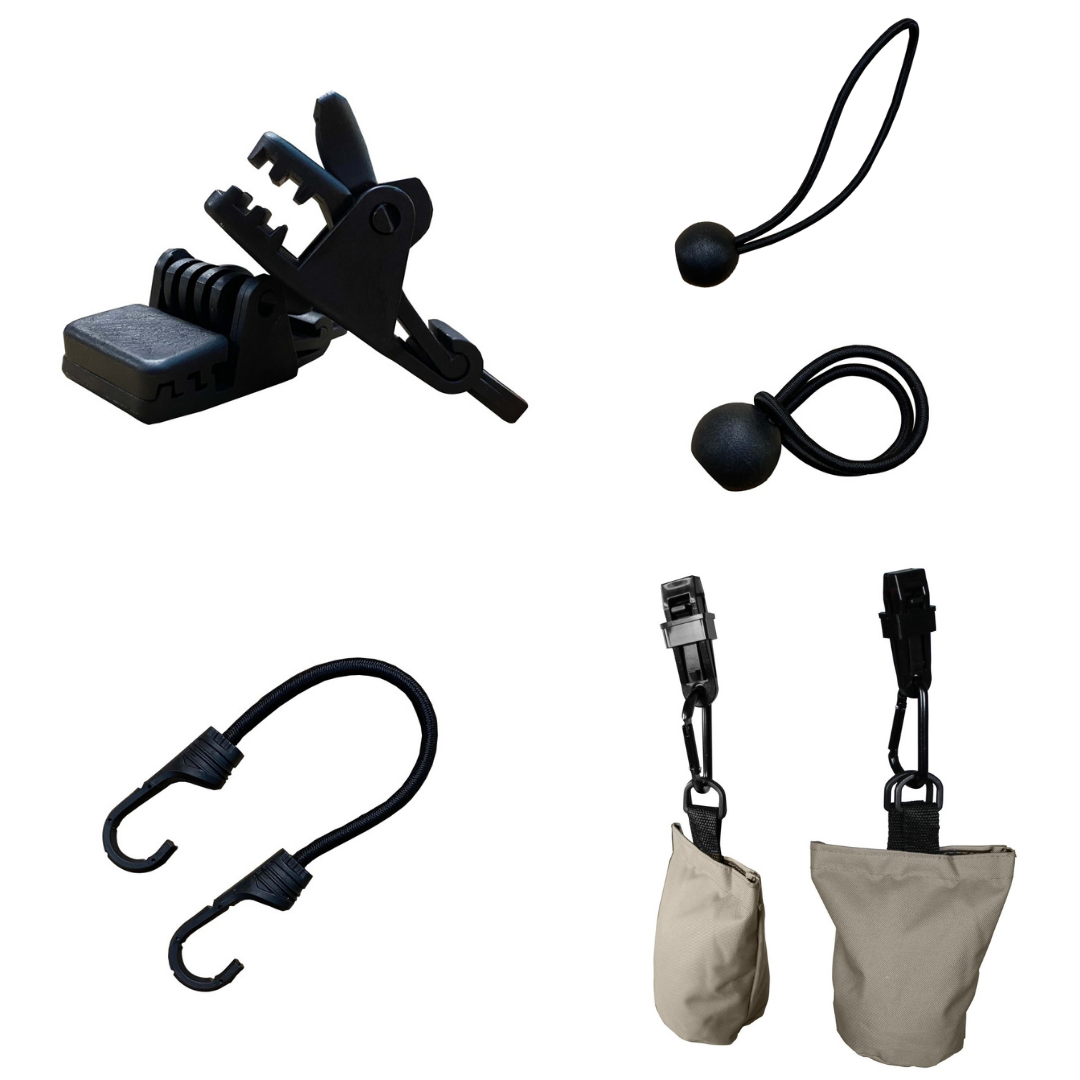 Sehen Sie sich unsere Kategorie Zubehör an und wählen Sie Klammern, Haken, Spanngummis, Bungee-Balls und Sandtaschen.