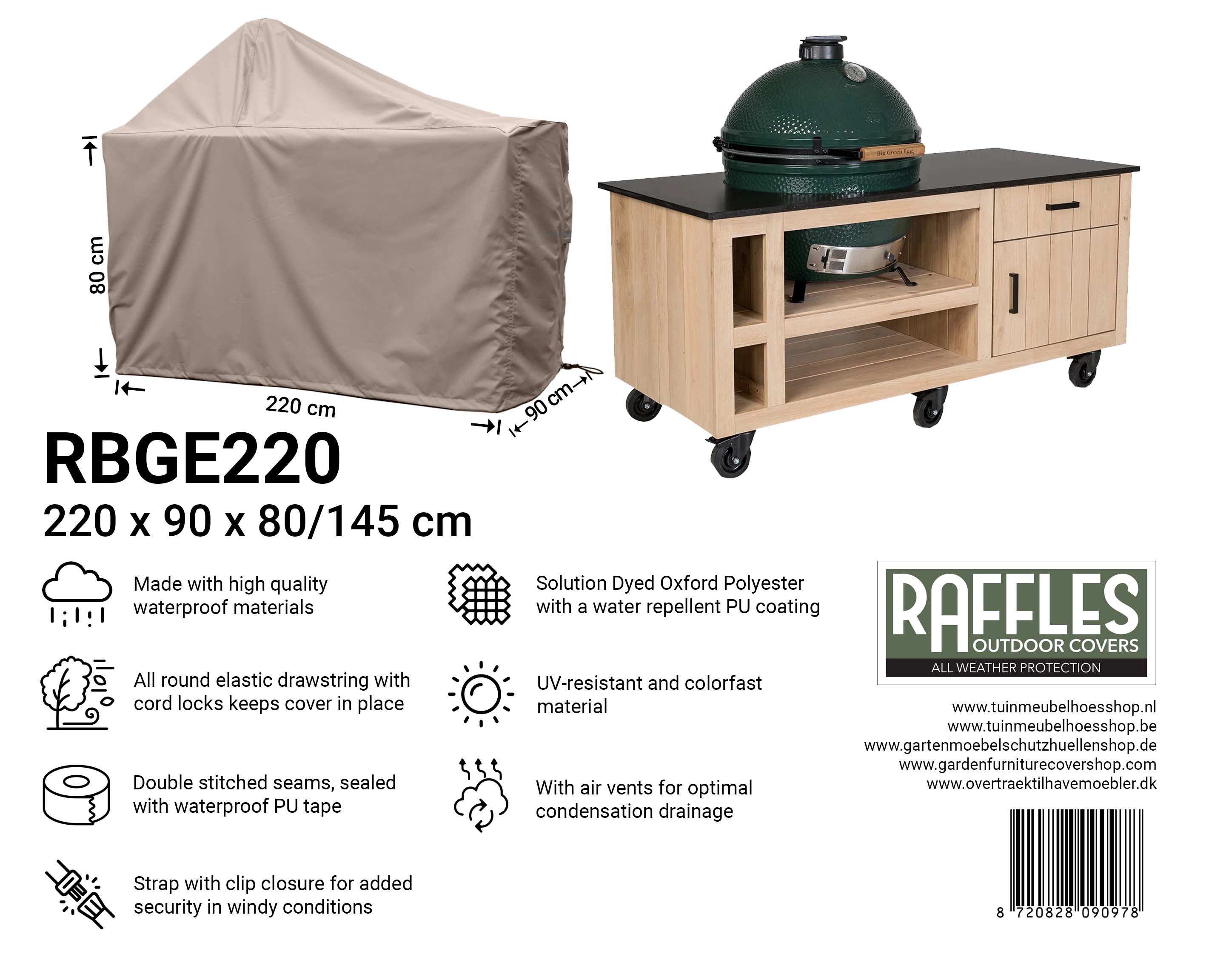 Mit den RBGE-Serienabdeckungen von Raffles Covers schützen Sie Ihren Kamado und den kompletten Tisch bzw. die gesamte Außenküche in einem Arbeitsgang. Die Hüllen wurden speziell für Grills entwickelt, die in einen Arbeitstisch, ein Frame oder eine maßgefertigte Außenküche eingebaut sind, sodass Tischplatte, Untergestell und Grill gemeinsam abgedeckt werden.