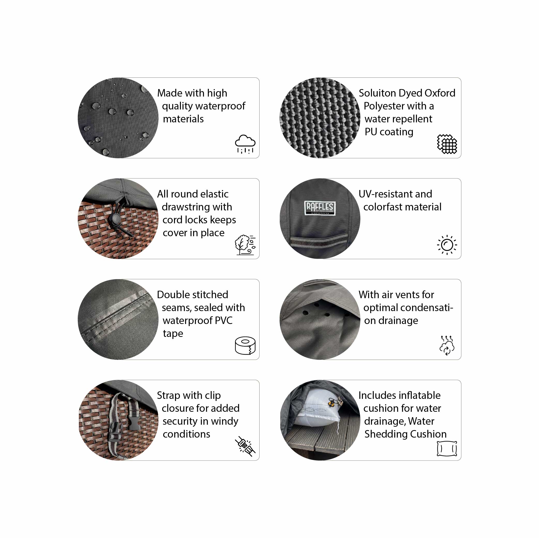 Raffles Covers Gartentisch-Schutzhüllen sind für den täglichen, praktischen Gebrauch entwickelt und lassen sich leicht anbringen und entfernen – auch bei langen oder breiten Tischen. Standardmäßig ausgestattet mit: