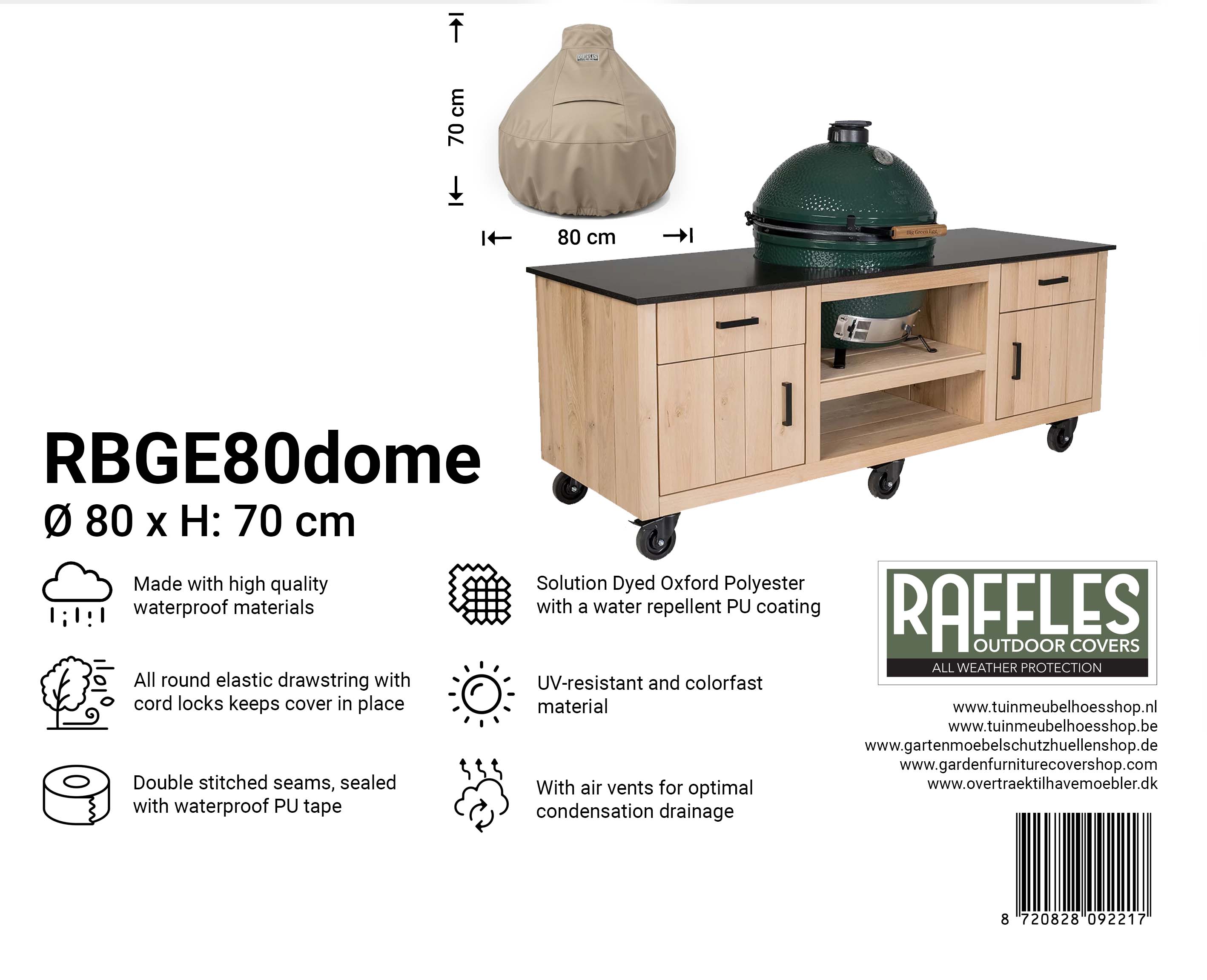 Die Raffles Covers RBGE-Serie wurde speziell für runde Kamado-Grills entwickelt, wie Big Green Egg, Kamado Joe, The Bastard, Grill Guru, Monolith, Primo und vergleichbare Marken. Egal ob Ihr Kamado frei steht, in einem Nest auf Rollen steht oder in eine Außenküche eingebaut ist: In dieser Serie gibt es immer eine Hülle, die zu Durchmesser, Höhe und Aufbau Ihres Kamados passt.
