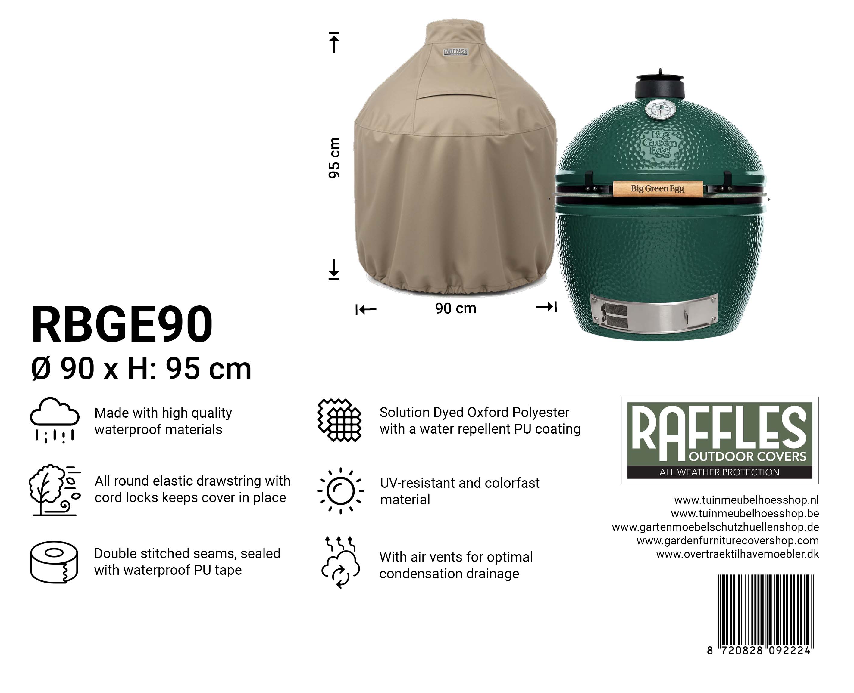 Die Raffles Covers RBGE-Serie wurde speziell für runde Kamado-Grills entwickelt, wie Big Green Egg, Kamado Joe, The Bastard, Grill Guru, Monolith, Primo und vergleichbare Marken. Egal ob Ihr Kamado frei steht, in einem Nest auf Rollen steht oder in eine Außenküche eingebaut ist: In dieser Serie gibt es immer eine Hülle, die zu Durchmesser, Höhe und Aufbau Ihres Kamados passt.