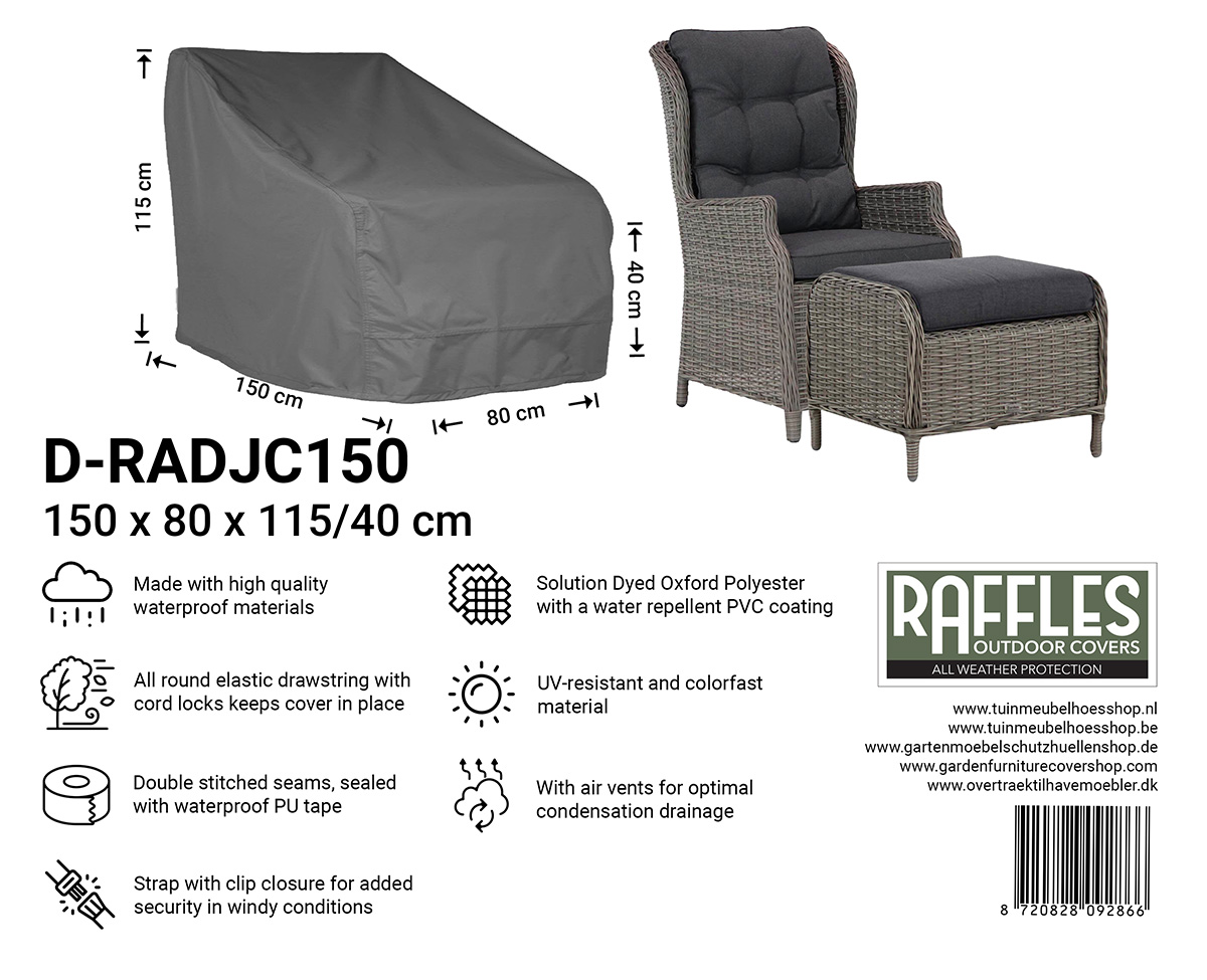 Mit der RADJC-Serie Loungesessel-Schutzhüllen von Raffles Covers schützen Sie Ihre verstellbaren Loungesessel das ganze Jahr über vor Regen, Schmutz, UV-Strahlung und Frost. Die neutralen Hüllen fügen sich dezent in jeden Garten ein und sorgen dafür, dass Ihr Loungesessel im Frühjahr sofort wieder sauber und einsatzbereit ist.