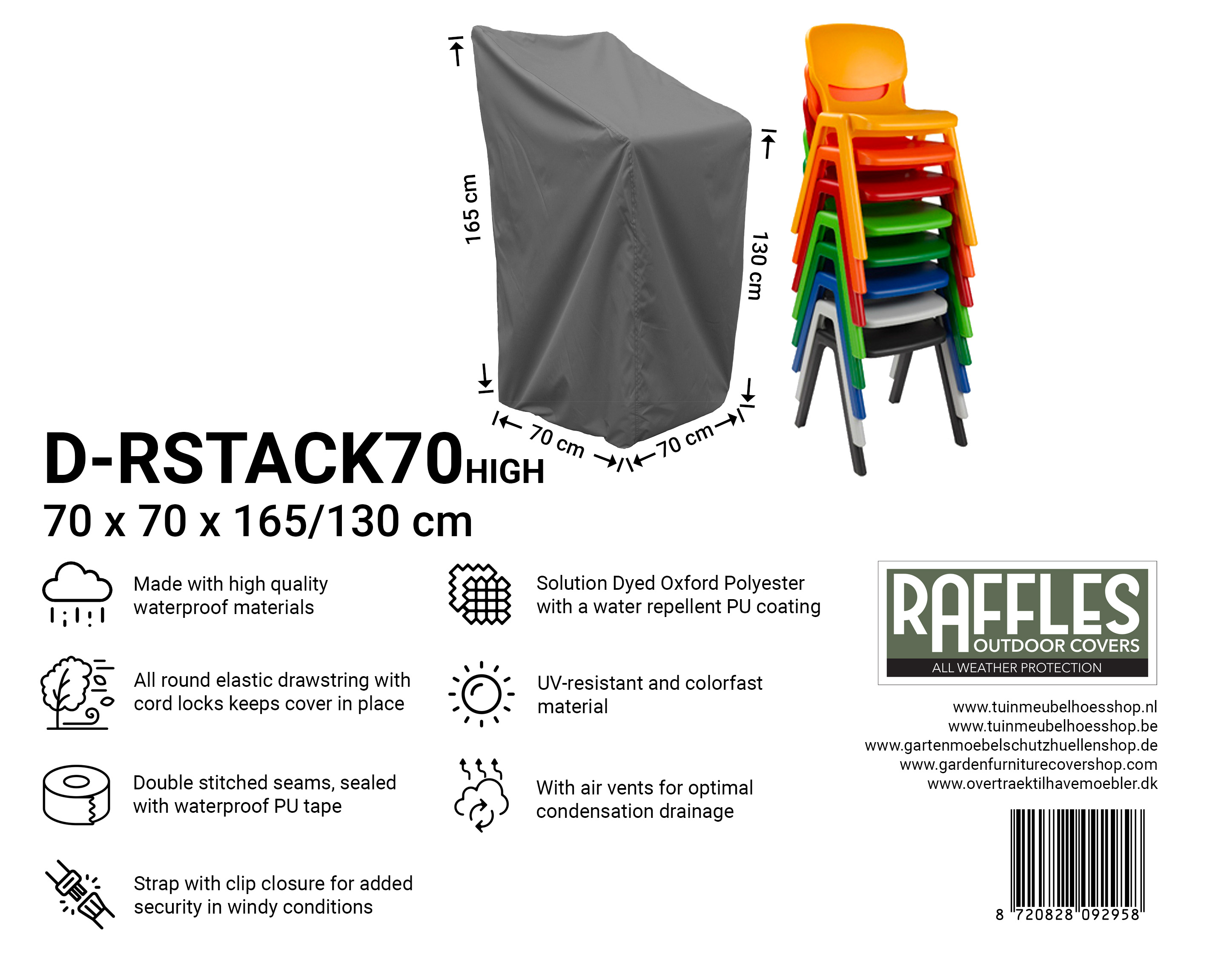 Mit den Stapelstuhl-Schutzhüllen der RSTACK-Serie von Raffles Covers schützen Sie mehrere Stapelstühle auf einmal vor Witterung und Schmutz. Ob Sie nun einen kompakten Stapel mit 4 Stühlen oder einen höheren Stapel mit bis zu ca. 8 Stühlen haben, es gibt immer eine passende Hülle, die Ihre Stühle vor Regen, Sonne, Schnee, Schmutz, Grünbelag und Vogelkot schützt.