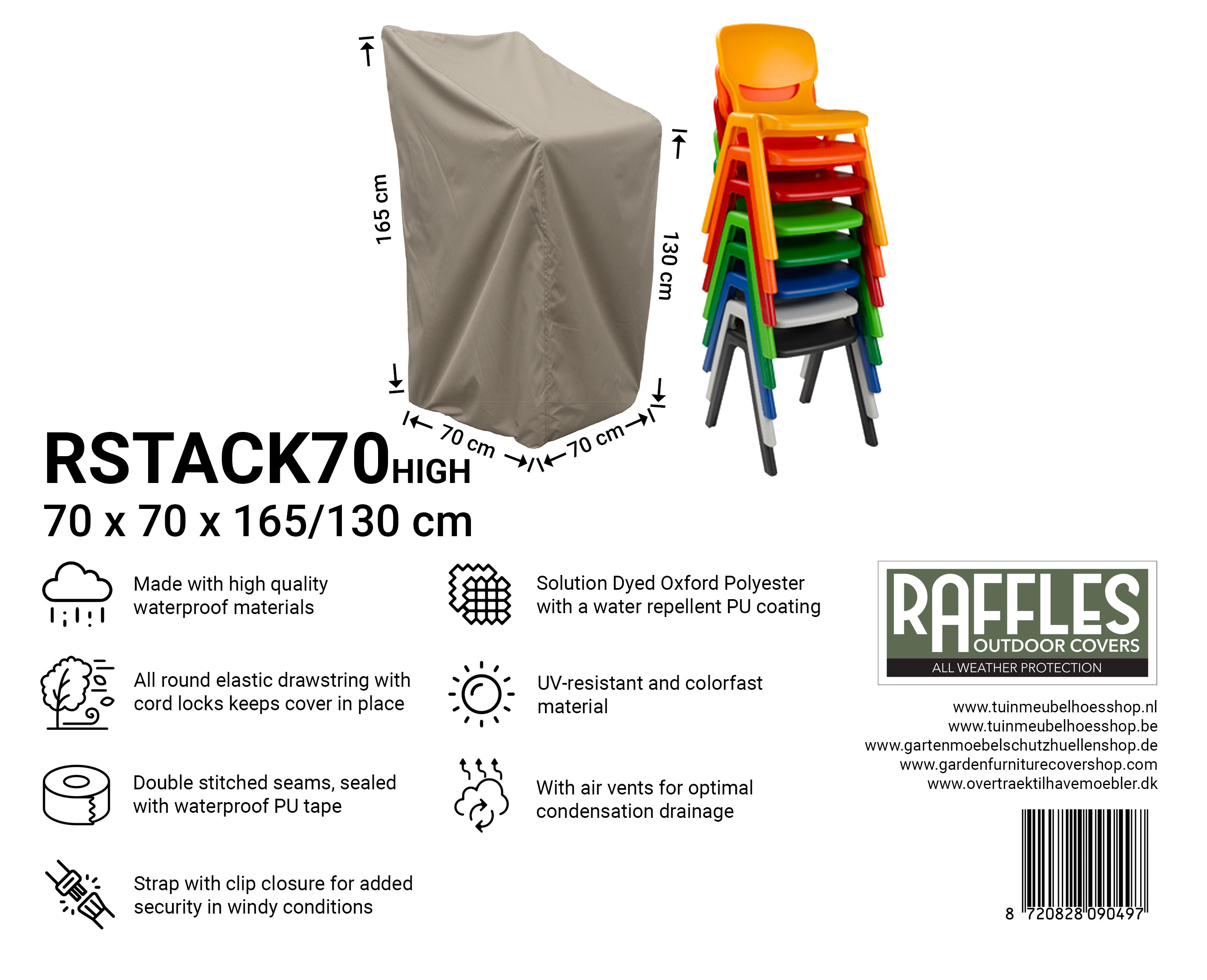 Mit den Stapelstuhl-Schutzhüllen der RSTACK-Serie von Raffles Covers schützen Sie mehrere Stapelstühle auf einmal vor Witterung und Schmutz. Ob Sie nun einen kompakten Stapel mit 4 Stühlen oder einen höheren Stapel mit bis zu ca. 8 Stühlen haben, es gibt immer eine passende Hülle, die Ihre Stühle vor Regen, Sonne, Schnee, Schmutz, Grünbelag und Vogelkot schützt.